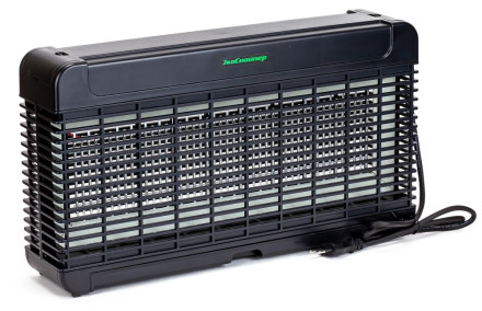 Сверхмощная модель антимоскитной лампы поможет защитить от нашествия летающих насекомых площадь до 300 кв. м. Корпус устройства выполнен из огнеупорного пластика, а мощные лампы привлекают насекомых с помощью излучения UVA типа. Именно такая длина световой волны наиболее привлекательна для комаров, муж, ос, слепней и даже моли. Привлеченные светом, насекомые попадают внутрь прибора, погибают от соприкосновения с решеткой, по которой пропущен постоянный ток. Затем они попадают в съемный лоток. Задача пользователя — очищать его по мере наполнения.